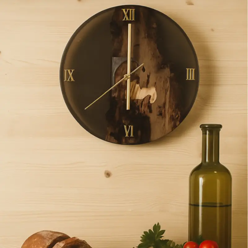 Die Wanduhr „Nature Grey“ verbindet natürliche Schönheit mit modernem Design. Gefertigt aus edlem Holz und grau-transparentem Epoxidharz, entsteht ein faszinierendes Spiel aus Licht, Tiefe und Struktur. Das halbtransparente Harz lässt das Holz elegant durchscheinen und macht jede Uhr zu einem einzigartigen Kunstwerk.